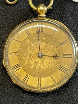 Watches: 18ct gold outer case open faced key wind pocket watch, champagne coloured dial with black Roman numerals.