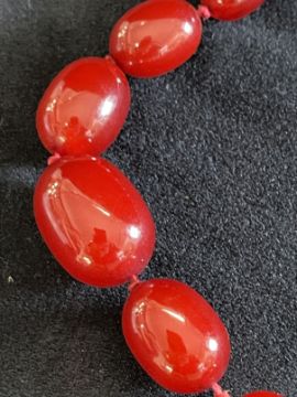 Jewellery: Necklet of sixty-nine graduated oval amber beads, ranging from 30mm x 21mm to 10mm x 4mm. Length of necklet approx. 40ins. Plus 'Angel Skin' branch coral necklet. Approx. width 20mm. Length 16ins. (2)