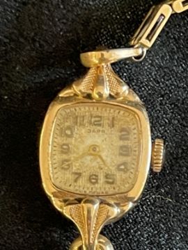 Watches: Ladies yellow metal wristwatch, cushion shaped dial with Arabic numerals attached to a yellow and white link bracelet. Tests as 14ct yellow and white gold.