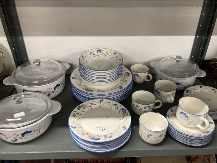 20th cent. Ceramics: Royal Doulton 'Expressions' cups x 5, saucers x 6, side plates x 8, graduated tureens with clear covers x 3, soup or dessert bowls x 9, dinner plates x 8.
