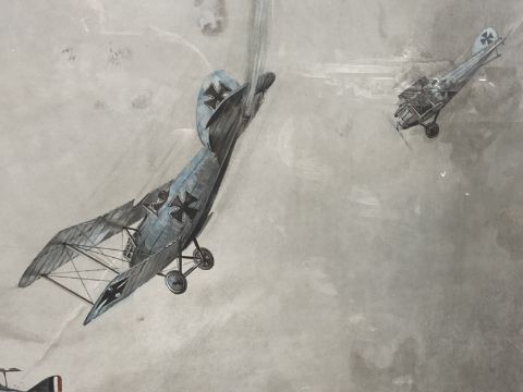 Royal Flying Corps/Militaria: Extremely rare WWI Official Government R.F.C training/promotional lithographic poster 'The Jackals' showing a dogfight issued March 1918 by The Air Technical Service. 37ins. x 24ins.