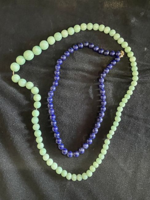 Jewellery: Georgian yellow metal collet set agate brooch. 14.5g. Plus Jade necklace 22ins. Lapis lazuli necklace with a 14K clasp. 16ins.