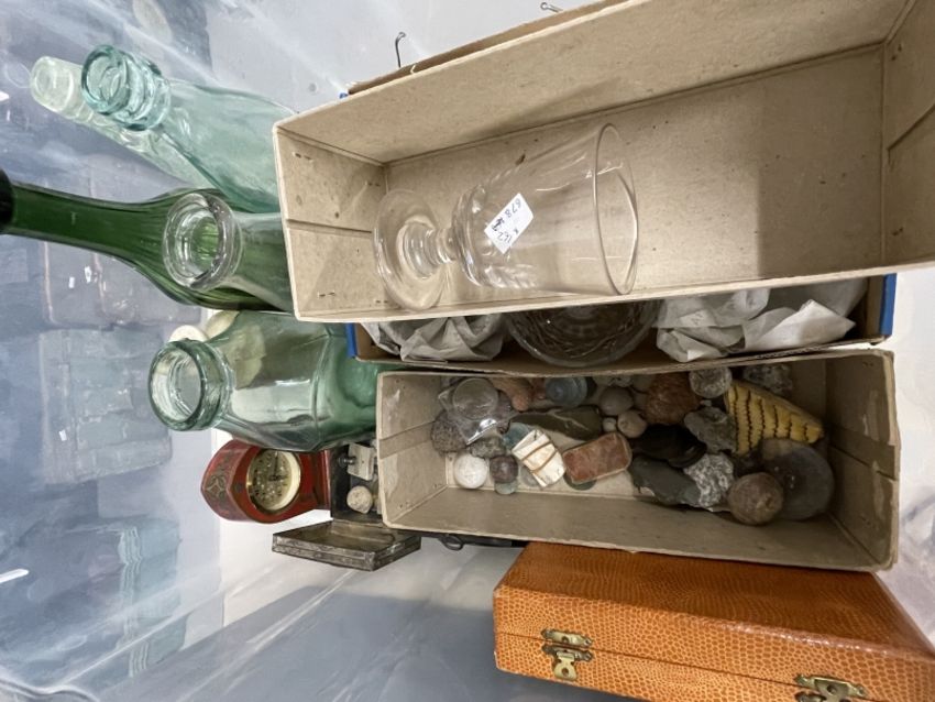 Objects of Virtu: Miniature ammonites and fossils, pottery shards, worked flints, earth eggs. Miniature German clock with a red lacquered case, miniature silver, belt compass, sleeve of miniature Bristol cigarettes, miscellaneous bottles, grapefruit servers and a 19th century rummer, etc.