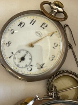 Jewellery: White metal open faced pocket, two brooches , one ring, bangle and one cross. All tests as low grade silver 800. Total weight 153g.