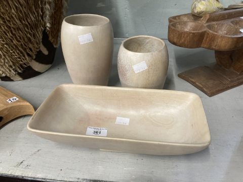 Africa/Tribal Art: Trio of hand crafted soapstone vessels (one large vase, one small vase, one rectangular bowl), East Africa.