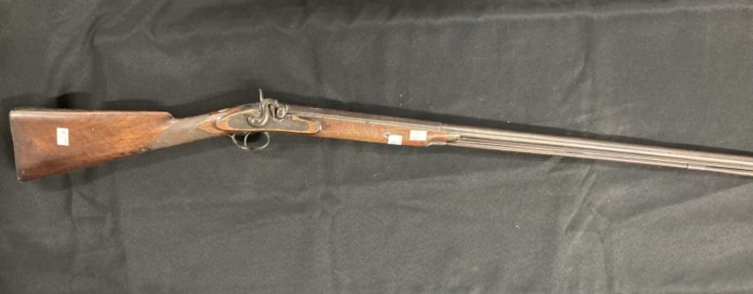 18th/19th cent. Percussion rifle, Damascus barrel, walnut stock, action plate signed Clarke, with ramrod. Length 48ins.