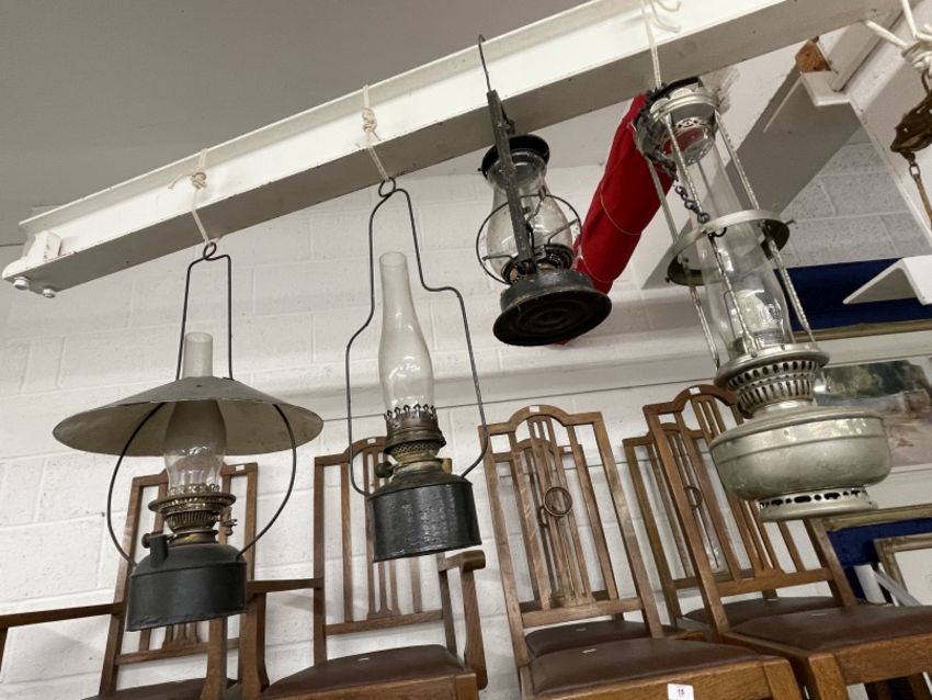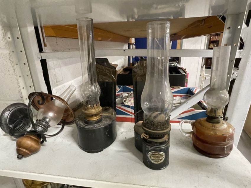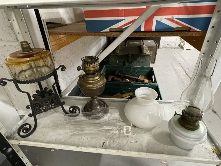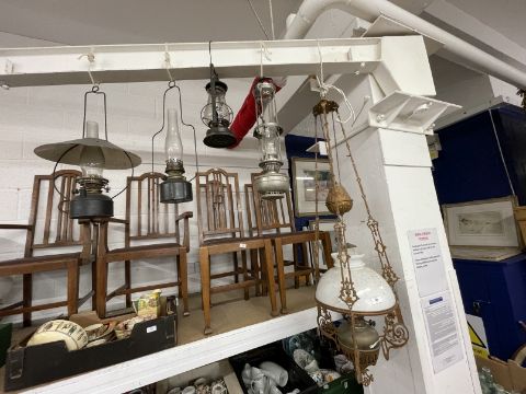 20th cent. Oil Lamps: Collection of oil lamps including five hanging lamps, one with a rise and fall fitting, two with fitted wall brackets, one of them with a brass maker's plaque J. Hinks & Son Birmingham and London, another with wall mounting converted to electricity, one with a glass base with built in handle, one with a wrought iron tripod base and two further lamps, one brass base and one with milk glass reservoir, on white shelf. Some with faults. (12)