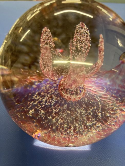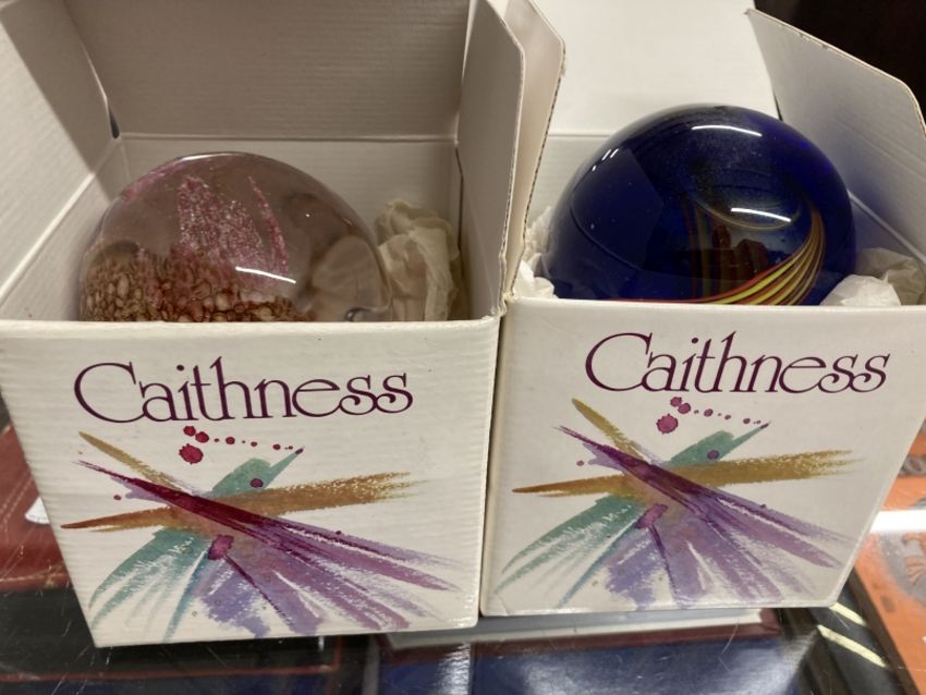 Glass: Caithness paperweights, Desert Orchid #489 and Virtuoso #274, both boxed.