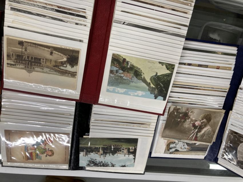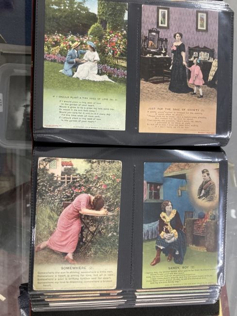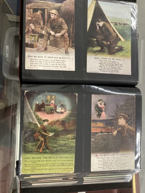 Postcards: Albums series cards, WWI, etc. British topographical, European cards, WWI silk, etc. (5 albums)