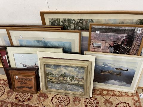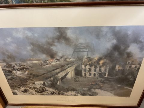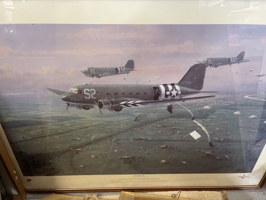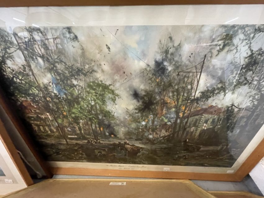 Military Prints: 4th Parachute Brigade, Oosterbeek Crossroads 22nd September 1944 by David Shepherd and signed by him. 35ins. x 20ins. Arnhem by G E Lea, Halifax Robert Taylor, Whitleys Over Tatton Park, Arnhem Bridge 2nd Day, The Bridge at Arnhem plus 10 other examples.