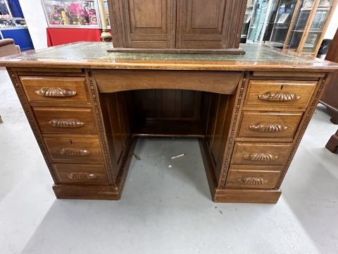 20th cent. Mahogany double pedestal desk, four drawers either side with carved handles, green leather skiver. 50ins. x 30ins. x 30ins.
