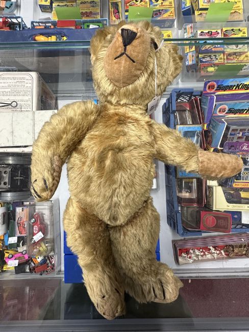 Toys: Merry Weather 1950 Teddy bear, glass eyes, 17¼ins tall very well loved.
