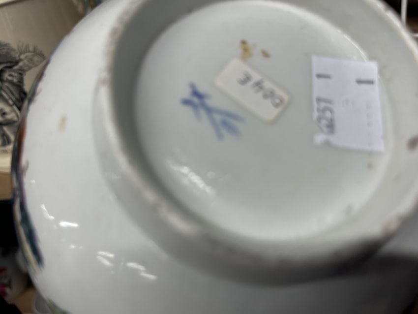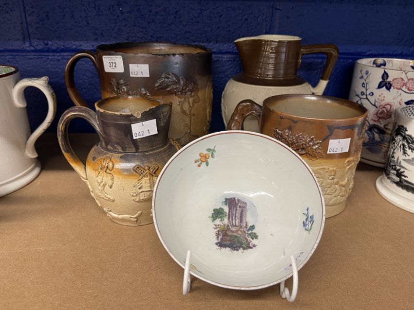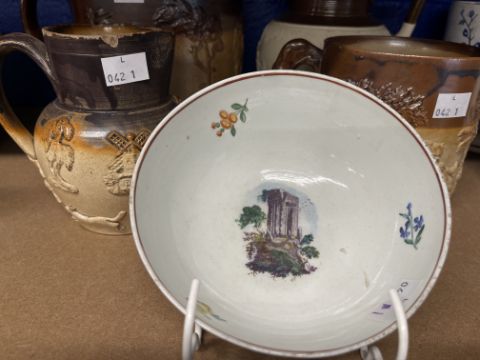 18th cent. Ceramics: Worcester small bowl, polychrome decoration of historic ruins and small floral embellishments. Crossed swords and numeral 9, c1755-1770. Dia. 5¾ins. John Turner dry bodied stoneware cream coloured jug with brown glazed neck and handle, small chip to inside rim, impressed Turner. 7½ins. Early 19th cent. Staffordshire stoneware sprigging saltglaze gallon tankard A/F, quart mug with hound handle, pint jug A/F.