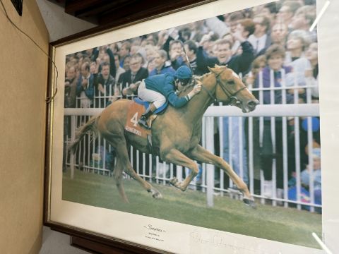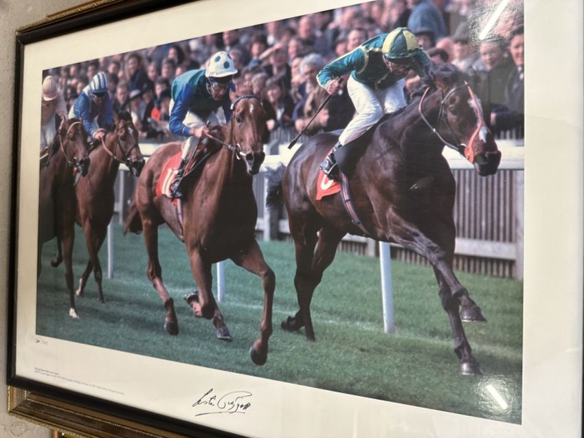 Prints: Large selection of horse racing limited edition prints includes "Lester Piggott" tribute "Frankie Dettori" tribute. (23) Framed and glazed.