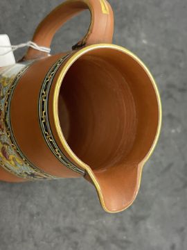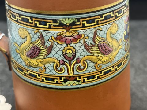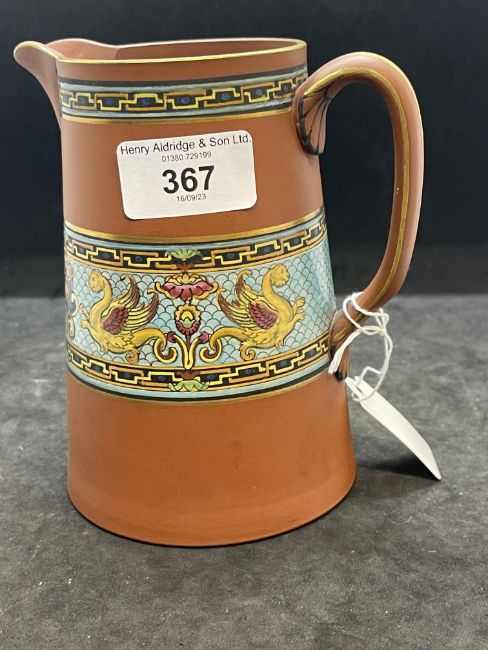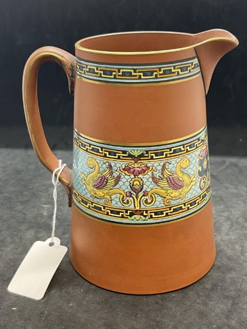 20th cent. Ceramics: Christopher Dresser for Watcombe Pottery style terracotta jug decorated with enamel band depicting Hippocamps on a scaled ground. Approx. 6ins.