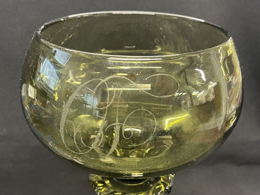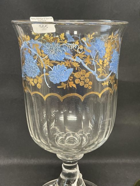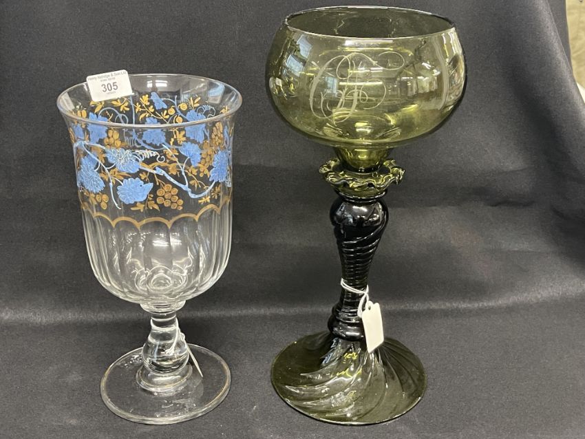 19th cent. Glass: Continental celery /large wine vase with blue enamel floral decoration, plus large grape and vine glass commemorative goblet with spiral stem and conical foot engraved C.F. 5/1/1882.