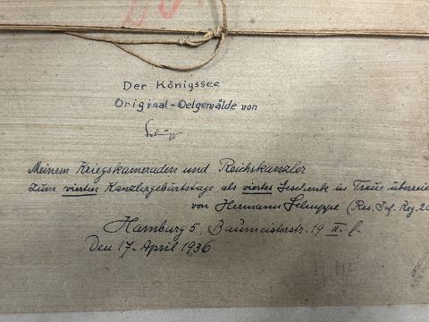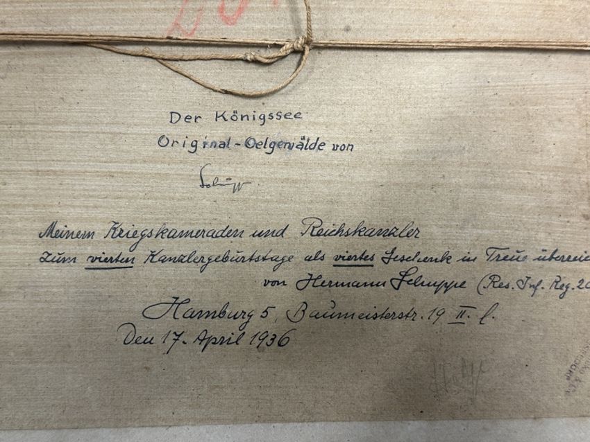 The lot being sold is one of the paintings given to Hitler, it is titled 'The Konigssee' a lake close to Hitler's mountain retreat at Berchtesgaden as with the second painting originally sold alongside it the varnish has bubbled showing exposure to heat, damage inflicted during the attack on the Chancellery during the Russians conquest of Berlin and the last stand of the Third Reich. The painting is by Hermann Schuppe, World War I veteran, with hand written notation ' My war comrade and Reich Kanzler for you as Reich Kanzler as the fourth present given in loyalty from Hermann Schuppe' on reverse 'Infantry Regiment 20, Hamburg 5, Baumeister Strasse 19. Captain Hodge recovered this painting from the Reich Chancellery at the same time at the telephone directory and represents a rare opportunity to acquire and item with peerless provenance to one of the most evil men in history, The sister painting to this piece bore a label "The Property of the Fuhrer No 473" 13ins x 9½ins. Sold with signed letter of provenance from Capt Hodges son together with scans of his original orders from the War Crimes Unit, press cuttings etc.