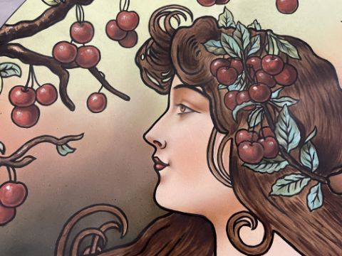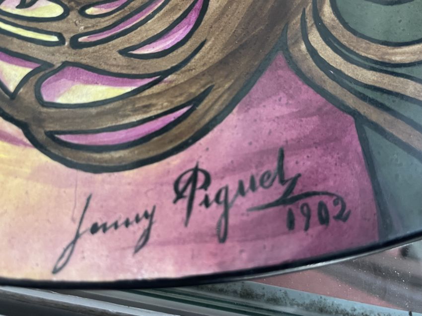 Arts & Crafts: Oversize ceramic charger of a stylised art nouveau maiden signed Jenny Piquel 1902. 20½ins.