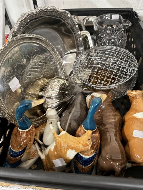 20th cent. Cut glasses, plate and ceramics Beswick animals A/F, resin dog figures x 2, commemorative plates, Spode , Masons Christmas plates, Cathedrals, Coalport birds, commemorative, etc. (2 trays, not included)