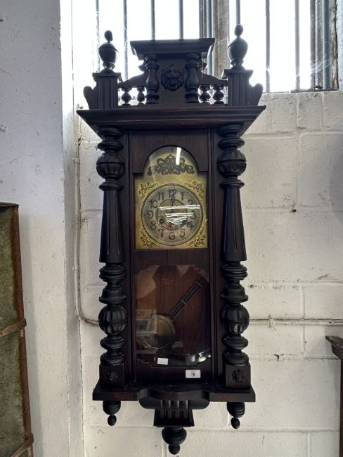 Clocks: Art Nouveau regulator with brass face and stylised spandrels. 43ins.