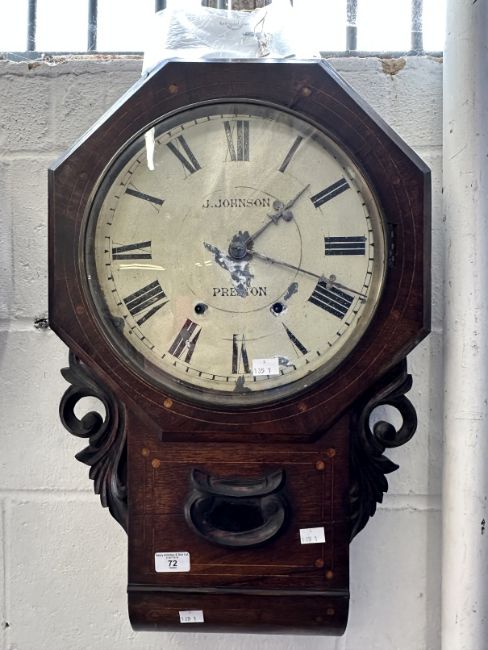 Clocks: American hardwood cased wall clock with fruitwood inlays. Retailed by J Johnson Preston 26ins. long by 16ins. wide.