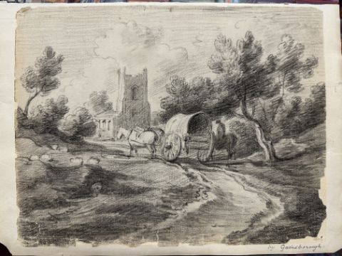 18th cent. Thomas Gainsborough (circle of): Graphite study, church with cart and rider in foreground, laid to paper, notation in margin 'By Gainsborough', damage to edges. 12ins. x 9ins.
