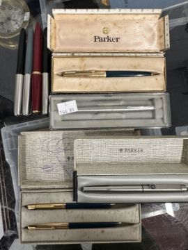 Pens: Parker pens, 4 boxed sets plus 4 others, one with 14k nib, unmarked body in red.