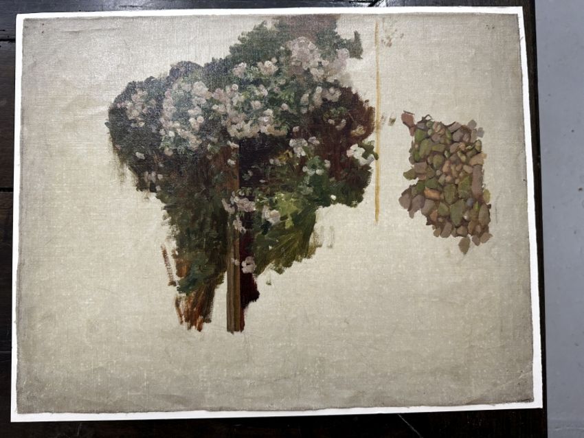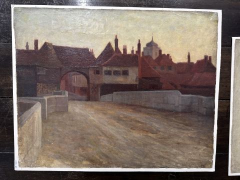 19th cent. Arthur Claude Cooke: Oil on canvas laid to card, study of flowers and stones, plus entrance to gated town (Sandwich in Kent, the archway is known as the Barbican).