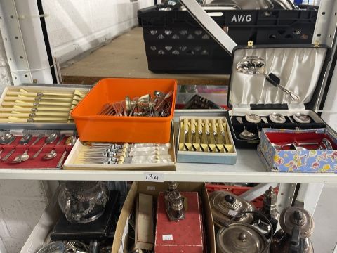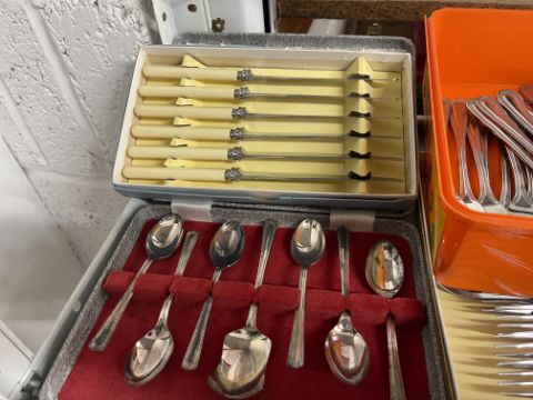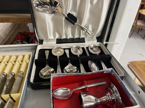 Platedware: Boxed set of teaspoons, boxed set of bone handled knives and forks, boxed set of fish knives, boxed set of dessert spoons, boxed Christening egg spoon set and one unboxed set.