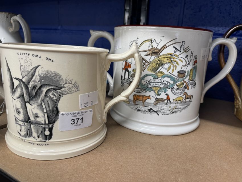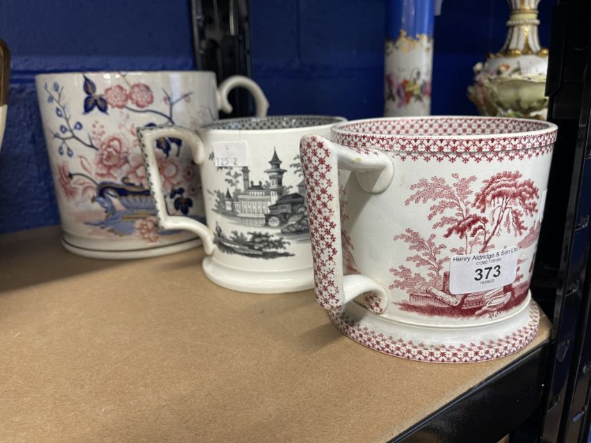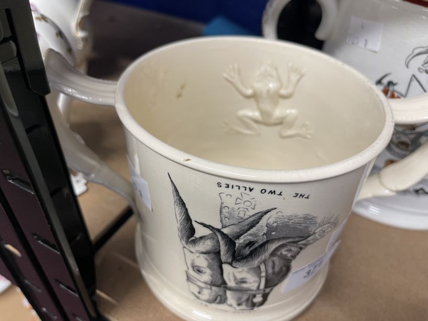 19th cent. Staffordshire Pearlware frog and lizard mugs, 'Japan' Imari style rim and handle A/F, black and white transfer with frog and lizard figures, red transfer mug with same transfer, plus green spotted lizard inside. (3)