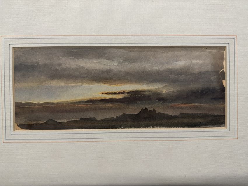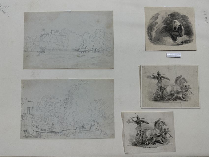Thomas Stothard (1755-1834): Ink studies, woman seated on a rock, Trojan war charioteer and Harding lithograph, plus rural landscapes, pencil studies after Samuel Colkett Norwich School x 2. After Peter de Wint: Watercolour sunset, damage to edges, mounted. 11ins. x 5ins.
