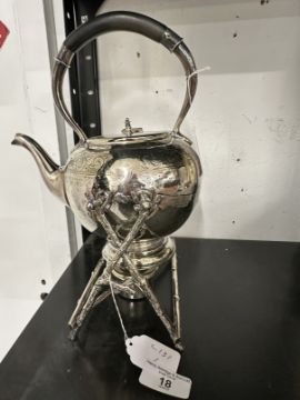 Silver Plated: Spirit kettle and stand, scroll decoration.