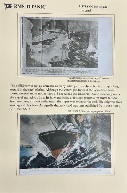 R.M.S. TITANIC: Unusual German postcards showing Titanic's collision with the iceberg (produced from an image in a newspaper) and the Lusitania being torpedoed.