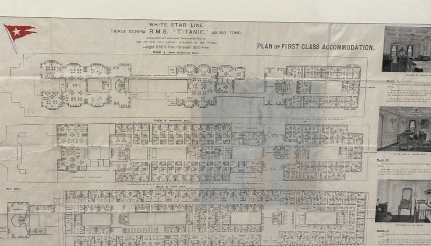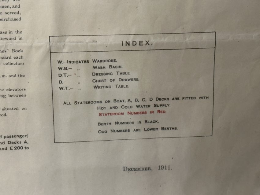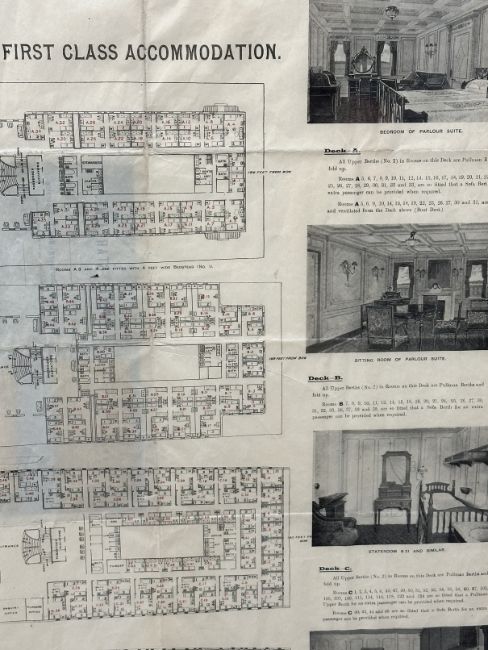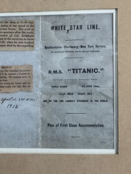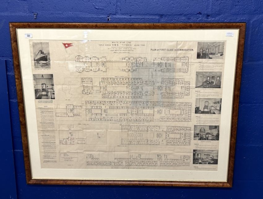 These plans were distributed to First-Class passengers who purchased a ticket to sail on Titanic. They often made their way onboard with the passengers to aid them in finding their way around the ship. Passengers were initially told that they were being placed into the lifeboats as a precaution and that they would likely return to the ship. Because of this, some passengers left their valuables on board but took items with them which would be necessary or helpful in the event they returned to the ship. Accordingly, this plan may have belonged to a surviving passenger who removed it from the ship during the evacuation with the expectation of returning when the all-clear was sounded. Measuring 5¼ins. x 10ins. folded and opening to an impressive 40ins. x 29ins. Framed and glazed.