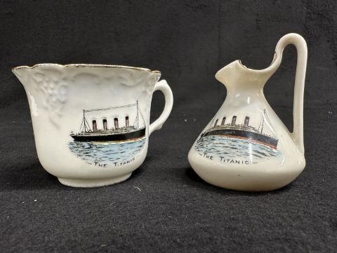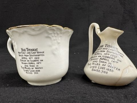 R.M.S. TITANIC: Unusual commemorative teacup in the style of Carlton ware plus another commemorative jug marked Carlton ware but A/F. Both 3ins. (2)