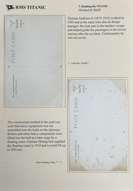 R.M.S. TITANIC: Rare Lafayette of Belfast real photo postcard of Thomas Andrews, Titanic's designer and Head of The Guarantee Group who was lost in the Titanic disaster. Plus a real photograph of the floating crane used to build Titanic.