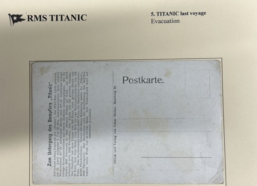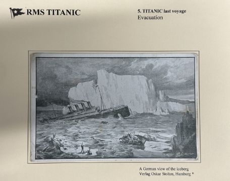 R.M.S. TITANIC: Rare German postcard showing an interpretation of the collision with the iceberg printed by Osker Stoltze of Hamburg.