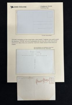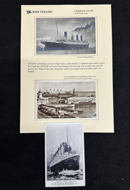 R.M.S. TITANIC: Real photo postcard of Titanic. Plus two others one Olympic, the other shows Aquitania in Southampton. (3)
