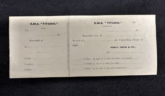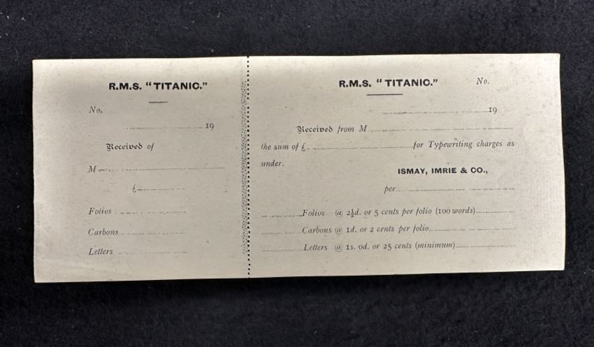 R.M.S. TITANIC: Rare typewriting charges receipt and stub. Ex-Onslows lot 103 18th May 1996.