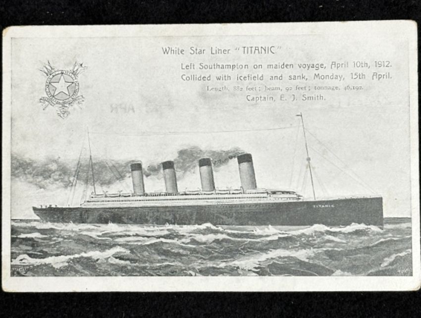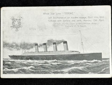 R.M.S. TITANIC: Postally unused Titanic postcard with message on reverse relating to Thomas Porteus, an assistant butcher on Titanic. The message itself reads in part, 'I thought you would like this picture of the Titanic, there was a Rochdale man drowned on it.'