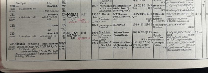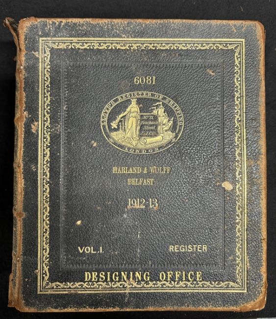 R.M.S. TITANIC: Extremely rare, possibly unique official Harland and Wolff drawing office 1912 edition volume I of Lloyds Register of Shipping. Tooled in black Morocco with gilt lettering, it is a complete chronicle of British and foreign shipping in 1912. R.M.S. Titanic is listed as having struck an iceberg and foundered, together with numerous details of the ship. R.M.S. Carpathia is listed under A.H. Rostron. 11ins. x 9½ins.