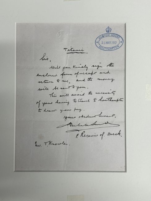 R.M.S. TITANIC: Unusual handwritten note from the receiver of wrecks stamped Customs House, Southampton 23rd May 1912 to Fireman's Messman Thomas Knowles relating to him drawing pay.