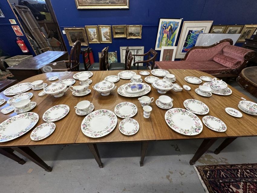 Wedgwood Hathaway Rose dinner service comprising eight of each 10½ins, 8ins, 6ins plates, saucers x 6, handled soup bowls/cups x 2, gravy boat and dish, vegetable tureens x 3, vegetable dish, 15ins oval serving plate, plus eight miscellaneous pieces. (56 in total)