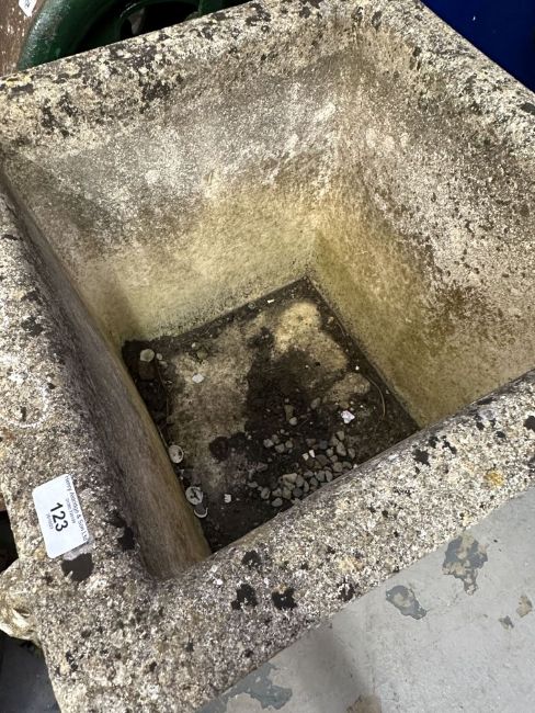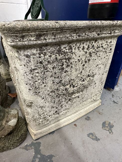 Reconstituted stone square planter decorated on all four sides. Pleasantly weathered. 20ins. x 20ins.