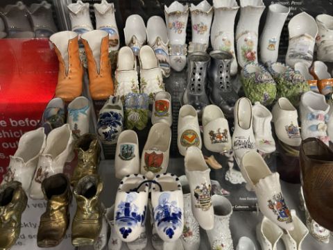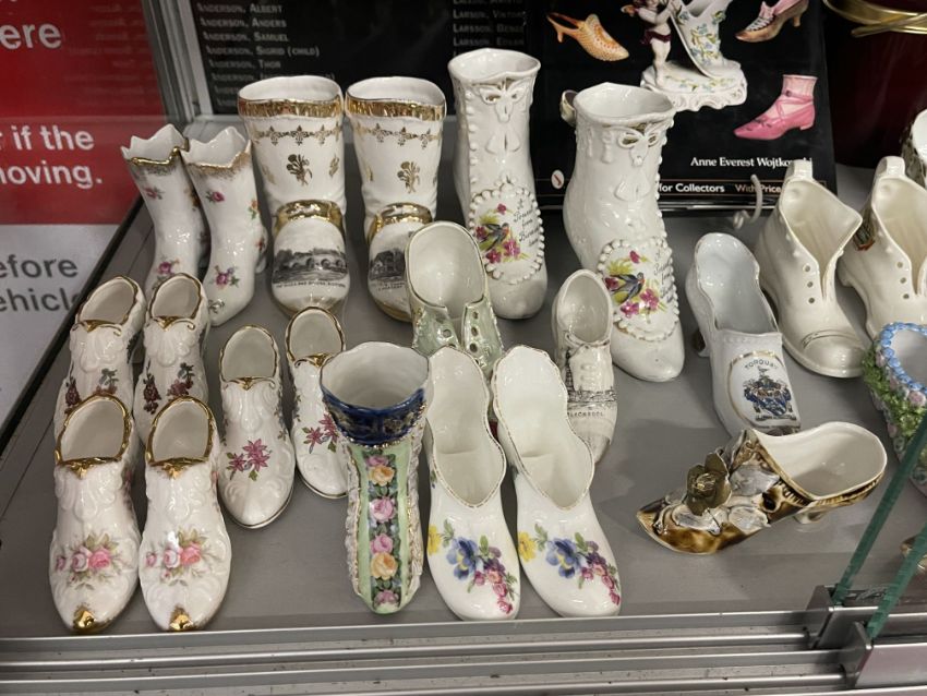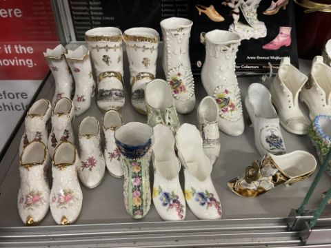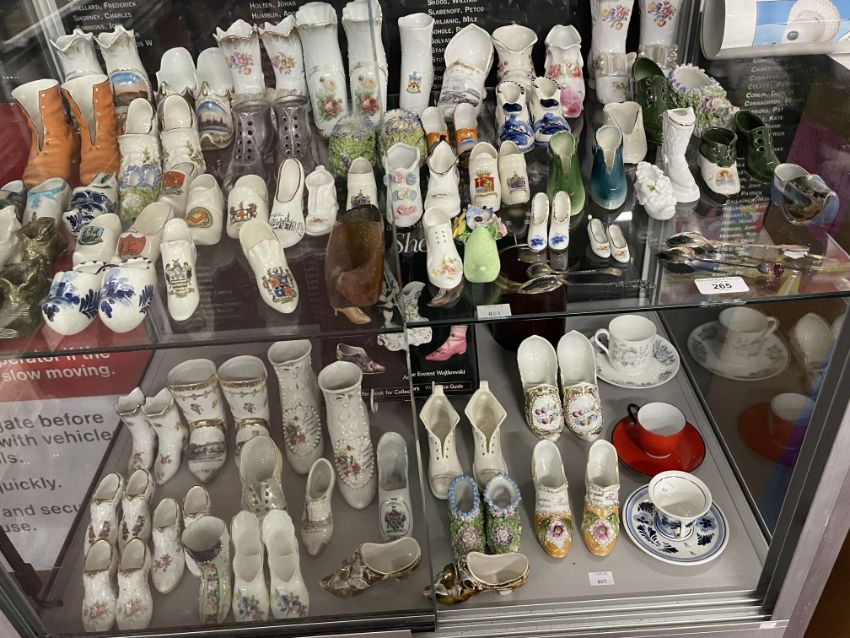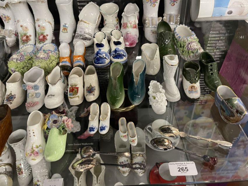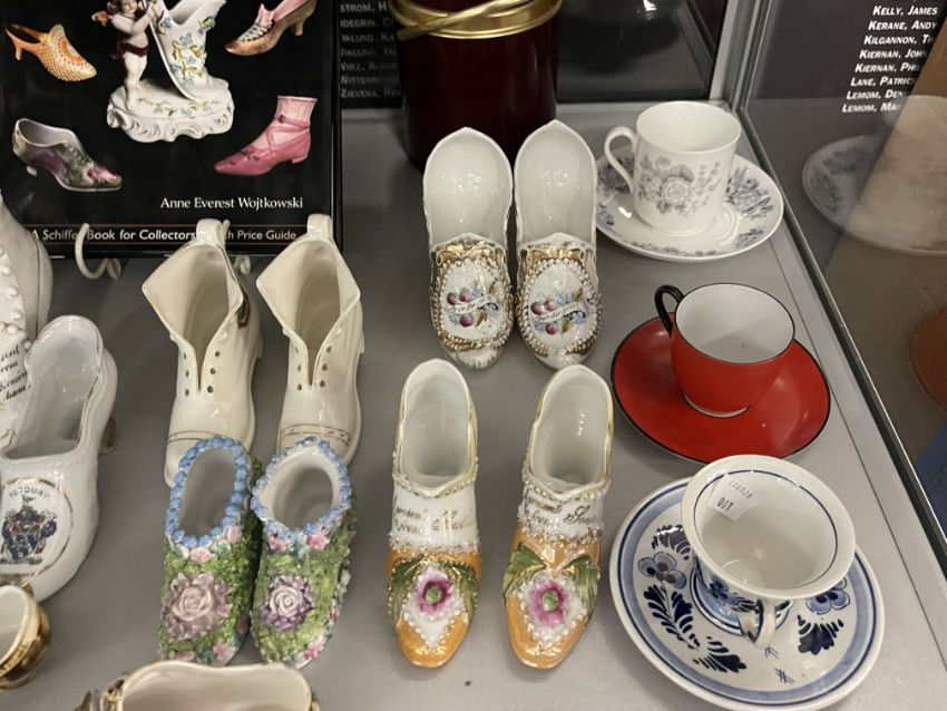 The Denise Kibble Collection ceramics, porcelain and pottery shoes. Souvenir shoes from around the UK, most in pairs, manufactured by W.H. Goss, Grafton Ware, Florentine China, etc. Applique, Majolica, transfer print, and Delft examples. Plus teaware, hallmarked silver spoons and Anne Everest Wostkowski book 'Porcelain and Pottery Shoes'.