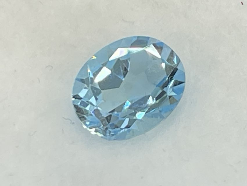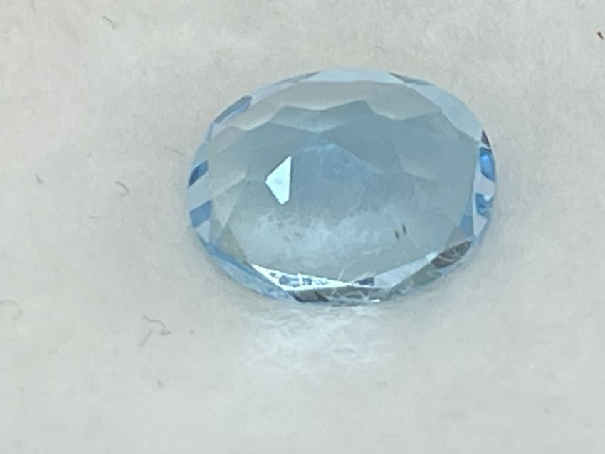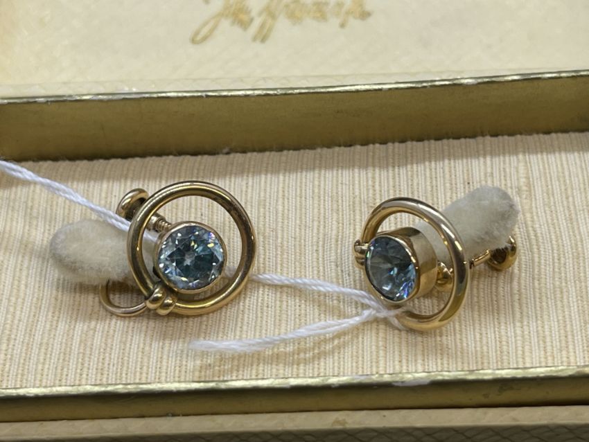 Yellow metal earrings screw fittings set with blue topaz, estimated weight 3ct. Marked 14ct. Weight of earrings 4.8g. Plus a loose oval cut blue topaz. Weight 3ct.