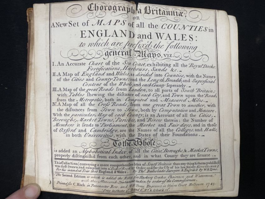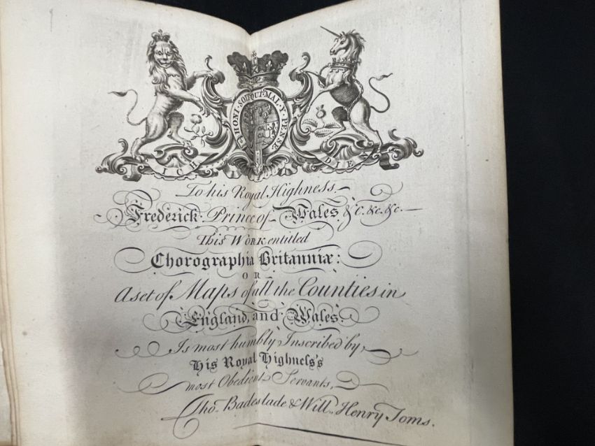 Maps/Books: Antiquarian maps, books and Atlases: Badeslade (thomas and William Henry Toms). Chorographia Britannia, a set of maps of all the counties of England and Wales. J Clark, C Hitch and WH Toms, London 1742. Double page ttitle, dedication, four general maps, five tables, and 42 uncoloured engraved county maps. Calf leather bound, ribbered and gilded spine. John Earl of Loundoun personal library label inside front board.