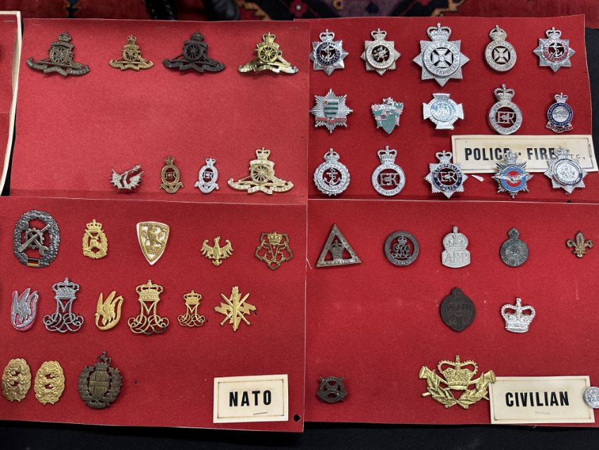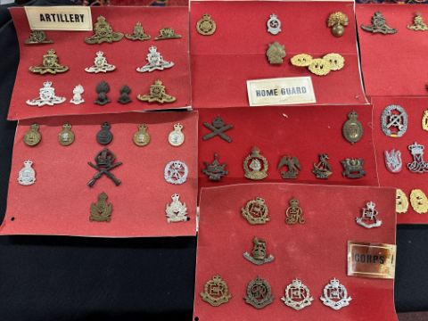 Early examples WWI-II and later, regiments include Royal Artillery x 17, Military Foot Police, R.M.P x 5, A.C.C x 6, Intelligence Corps x 2, School of Musketry, Naval Div badges, BN Drake, Hawke, Benbow, Collingwood, Nelson, Howe, Hood, Anson, Home Guard, U.T.P, Police and Fire badges x 15, A.R.P, On War Service, NAAFI, Service Rendered, Scout, Womens Land Army, Old Contemptable Assn, For Loyal Service, some staybright.