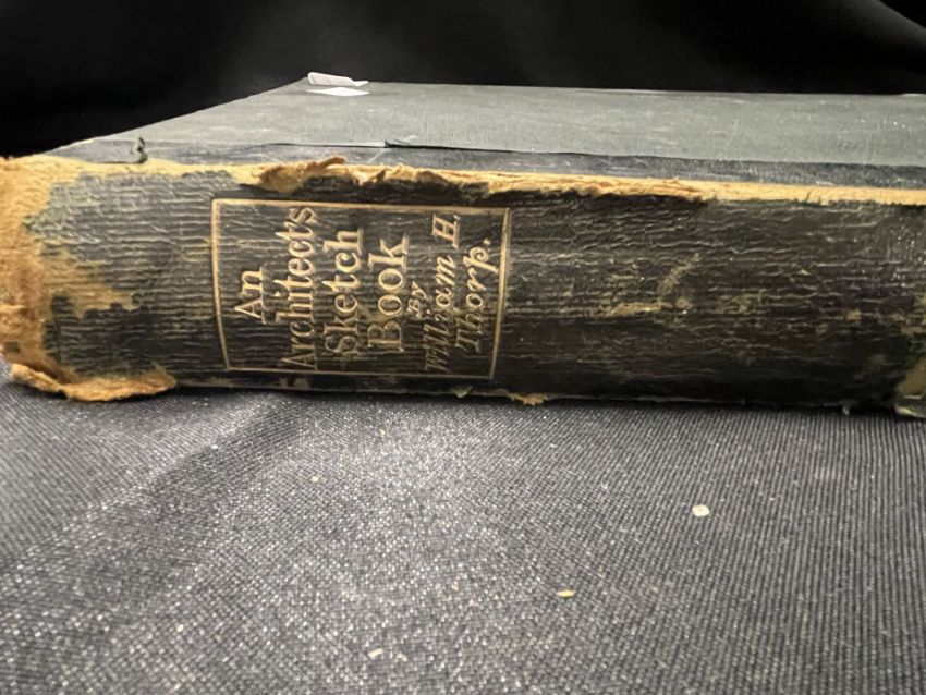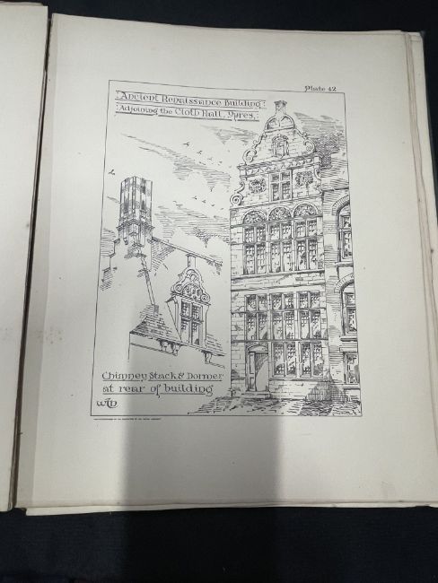 An Architect's Sketch Book at Home and Abroad by William H. Thorp, published by Richard Jackson, Leeds, 1884. Original front and back covers, more than seventy full page plates, English, Flemish and German styles, including Bruges, Ypres, etc. First edition limited to 400 copies, this being number 46. Some pages detached.
