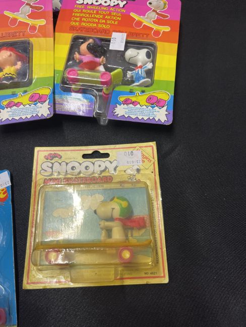 Peanuts and Snoopy collectables. Selection of skateboarding themed, mint, in packaging toys by United Feature Syndicate includes, Snoopy Skateboard with freewheeling action x 5, red card, Woodstock, Joe Cool, Snoopy Skater, Snoopy Flying Ace and Charlie Brown, rainbow card x 4, Cowboy and Native American Snoopy, Joe Cool and Charlie Brown, Lucy and Snoopy and Linus and Flying Ace. Plus Aviva wind-up Snoopy skateboarder and ramp and mini skateboard.
